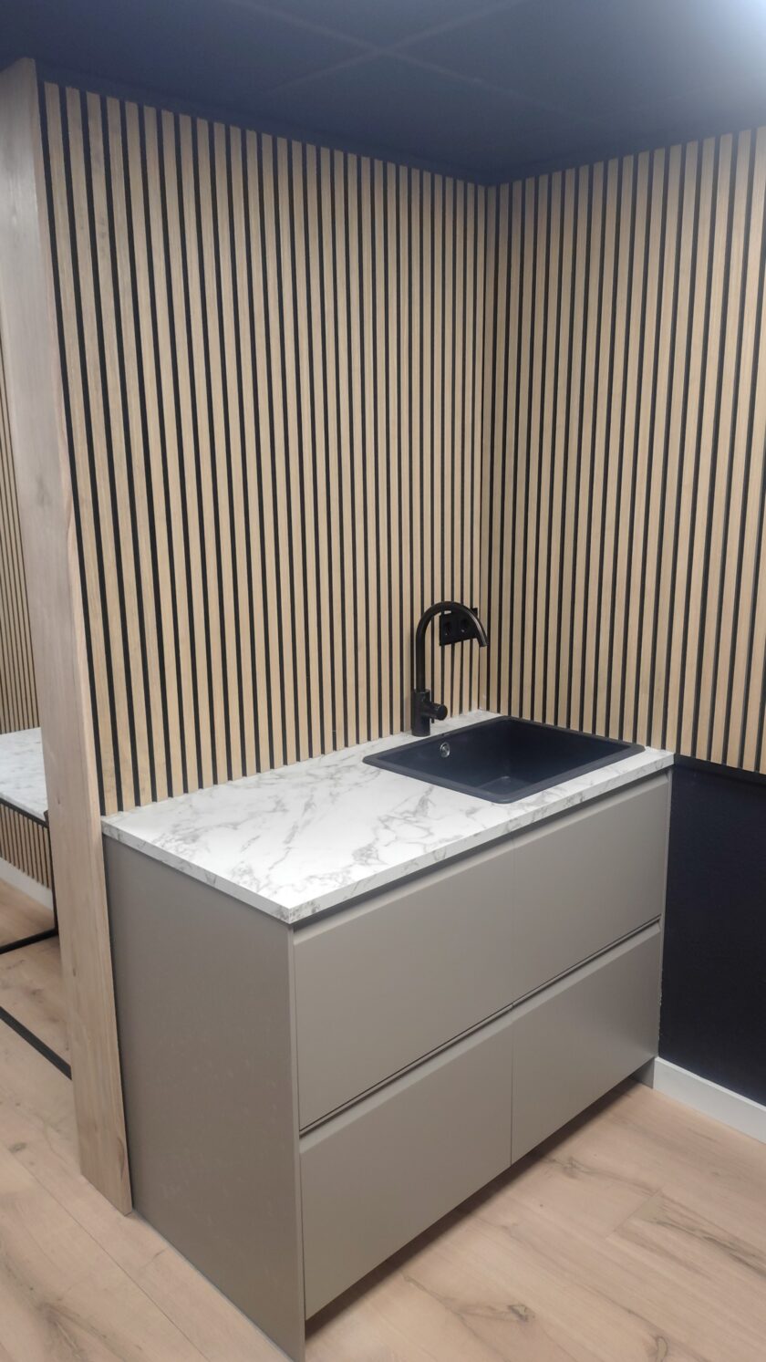 - Kantoor voorzien van zwart systeemplafond, akoestische panelen en eiken parketvloer